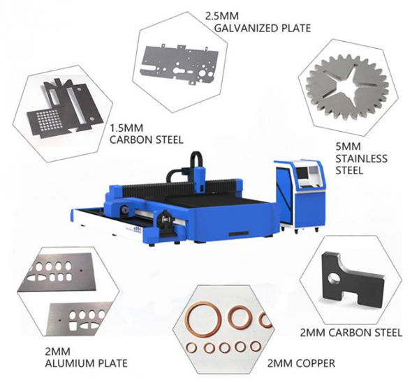 * Specielt brugt til opskæring af 0,5-6mm kulstofstål, 0,5-5 mm rustfrit stål, galvaniseret stål, elektrolytisk zinkbelagt stålplade, siliciumstål og andre slags tynde metalplader. 1000W kan skære 3 mm aluminium og 2 mm kobber.